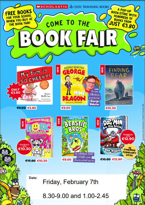 Book Fair will take place on Friday 7th February where students and their parents will have the opportunity to visit Halla Oilibhéir to buy books and see our wonderful Book Fair Projects!